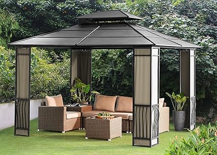 Gazebo De Jardin Al Aire Libre 12 X 10 Gazebo De Patio Dosel De Aluminio Permanente Tapa Dura Mosquitera Y Cortinas Para La Zona De La Piscina